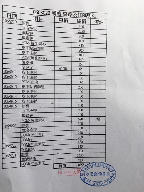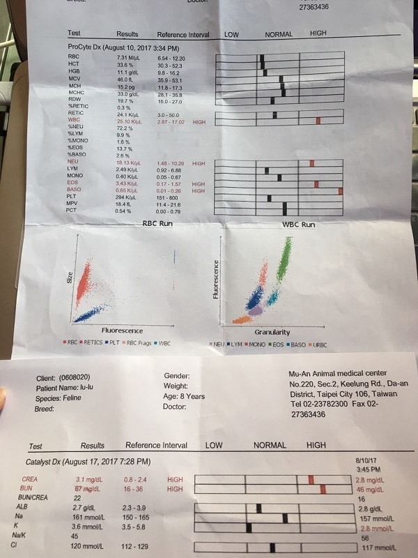 8/16回診,嚕嚕已有胖一些,血檢驗腎臟是否異常,血檢報告指數偏高,確定是腎衰竭貓咪,之後需定期回診追蹤,目前需再吃兩個禮拜的抗生素看呼吸道問題會不會好轉,兩個禮拜後回診驗大便及血檢.