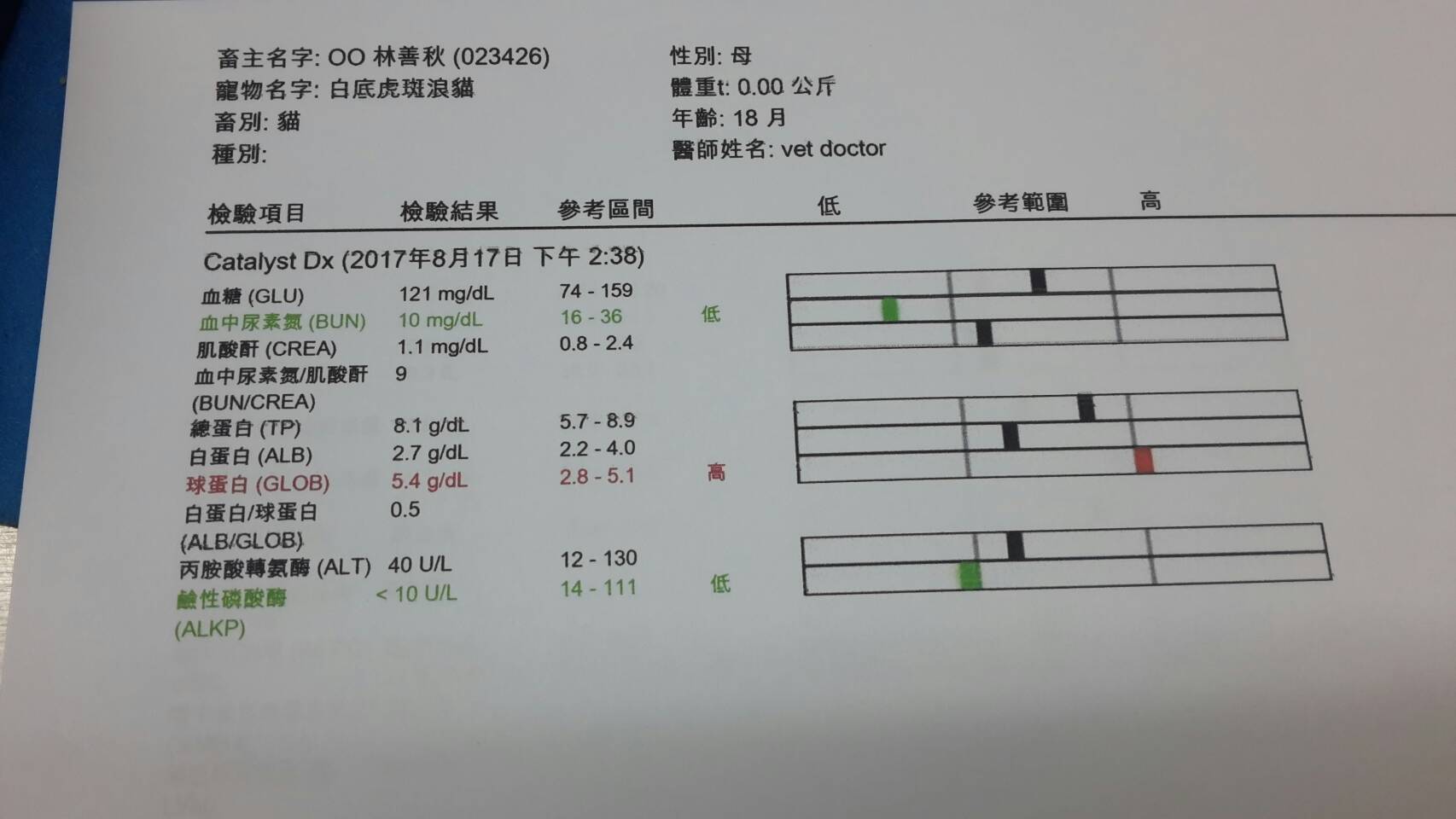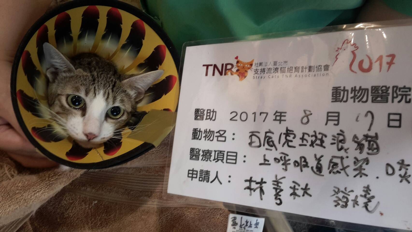 主題: 食慾不振、呼吸聲異常的白底虎斑貓 申請者姓名: shan-chiu Lin 花色: 申請日期: 2017-09-11 16:00:29 申請者部落格: 申請者臉書網址: shan chiu lin 所在縣市/合作醫院: 高雄市/銀星動物醫院 治療費用: 5000元 需求人數: 12人 已結案 (2024-06-01 13:23:53) 報名人員: Jia-wei(已付款)、Lian Kim(已付款)、Sarah x2(已付款)、Min-Chen Chang(已付款)、HENSON(已付款)、LaVieShop拉米手作(已付款)、Fatefaye Wu(已付款)、旺伯(已付款)、薇薇安(已付款)、靜小芳 x2(已付款)、 候補人員: 動物病情說明: MM7月初剛生小貓,每天餵奶食慾都很好,尚星期陸續聽到有打噴嚏聲,給予離胺酸因應,卻無改善。