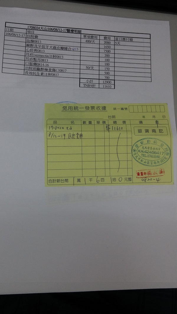 大山目前位於安養中心持續接受復原照顧當中,本次的醫療收據如圖