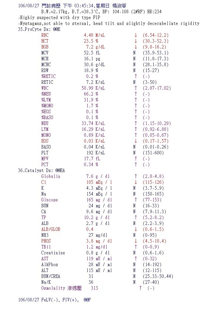 經醫師檢查發現瘦瘦有中度貧血.白血球極度偏高.黃疸.肝指數輕微偏高