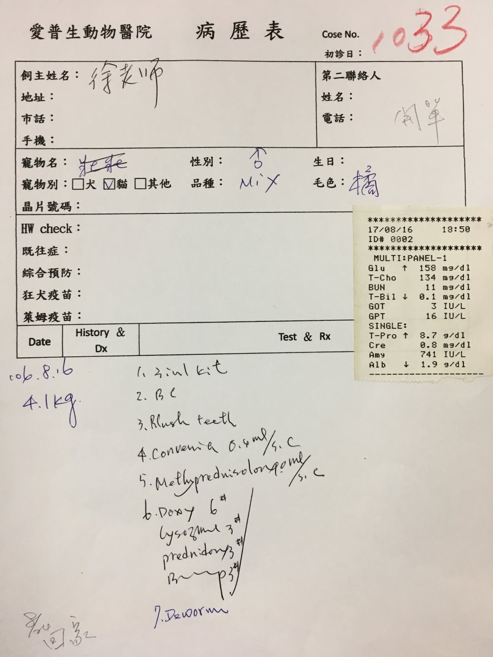 主題: 口炎麒麟橘白 申請者姓名: 何旻倫 花色: 申請日期: 2017-09-02 20:41:55 申請者部落格: 申請者臉書網址: 所在縣市/合作醫院: 台中市/愛普生動物醫院 治療費用: 8000元 需求人數: 18人 已結案 (2024-06-01 13:22:44) 報名人員: 棉花糖 x4(已付款)、Chihwei Chen(已付款)、薇薇安(已付款)、李吱吱(已付款)、陳勇智(已付款)、林雅雯(已付款)、大瑞 x2(已付款)、Chih C Chih(已付款)、張雅雯(已付款)、Hsiu-hung Lin(已付款)、Jessica Hsu x2(已付款)、nicole chen(已付款)、詹曉青(已付款)、 候補人員: 動物病情說明: 台中廢棄眷村,
