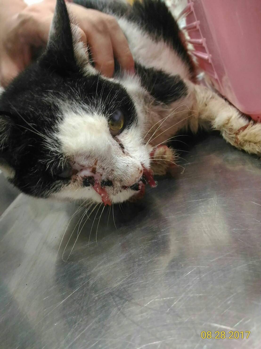 左眼受傷感染過久,已霧化看不清, 右眼發炎,鼻腔化膿腫脹,先抗生素針劑治療,住院期間有打點滴一週,食慾正常,因為鼻腔不時會流出黏稠血液。希望,轉院做比較詳細的檢查。晶晶的前額到鼻臉部腫起,鼻出血狀況,腫瘤的機率高,醫生有說,如果要積極治療,就是切片採樣確診是哪種腫瘤後,手術切除跟做化療,但是因為在頭部,切除要乾淨,可能半個臉就沒了,化療最後也會有抗藥性問題。