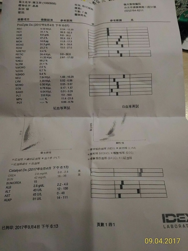 上週已經除蚤驅蟲,驗血液生化,原本肝腎指數稍高,貧血,愛滋白血陰性。。。