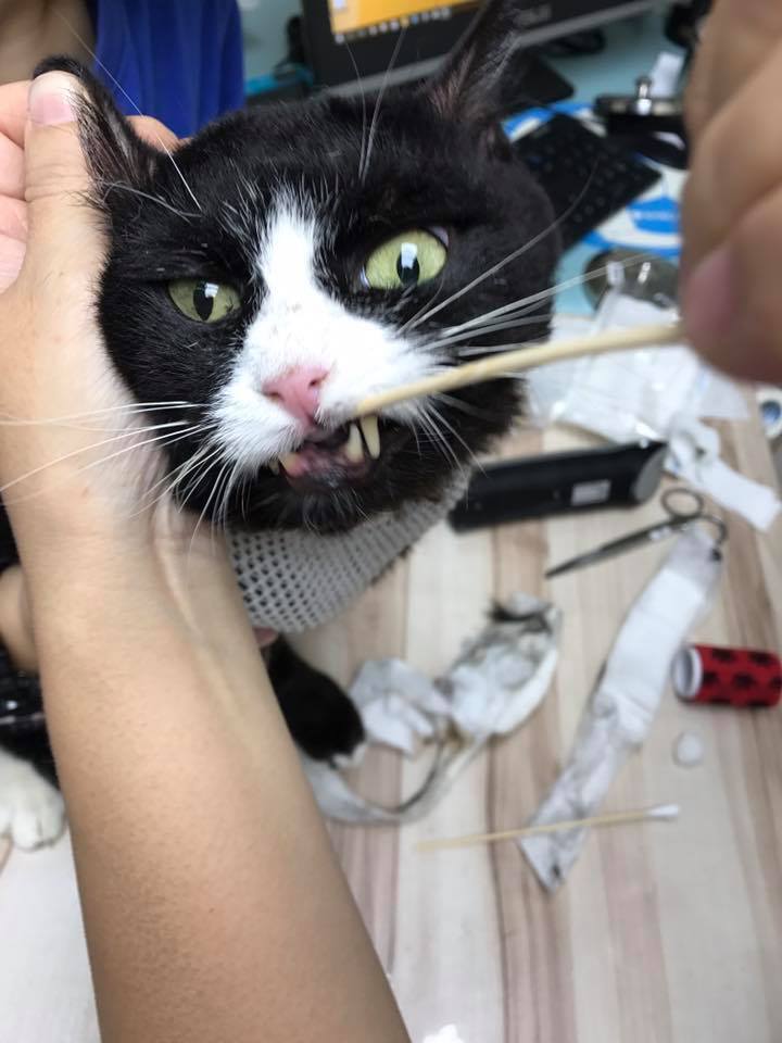 動物近況說明: 出院後的麵滷常會因舔毛進而嘔吐,導致餵食管掉落,