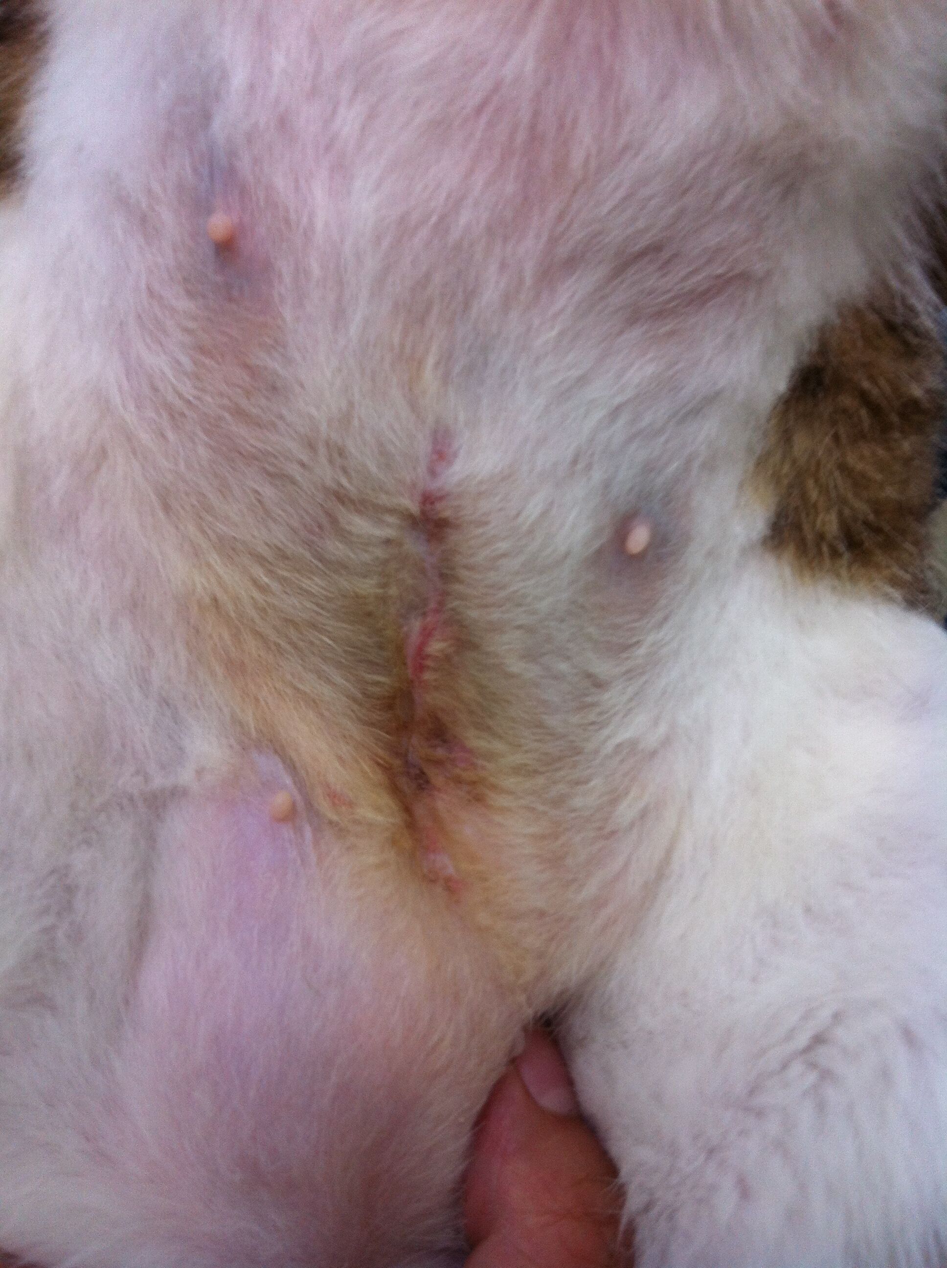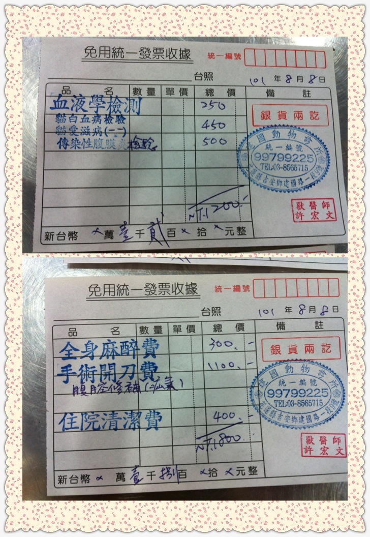 檢驗後無傳染性腹膜炎與貓愛滋、白血,己進行開刀進行 疝氣 手術吸收線需90天才能吸收,由於手術後傷口過度擠壓,造成腹部結紮線斷掉