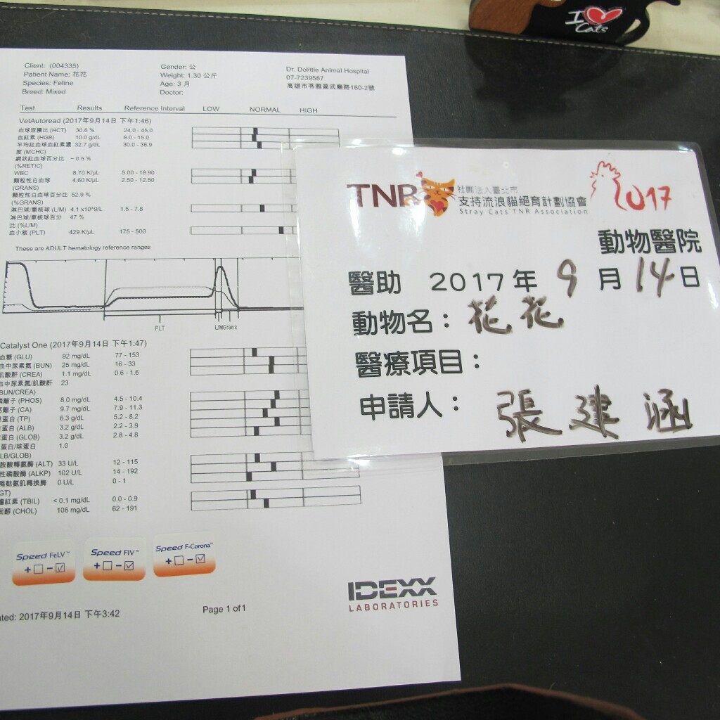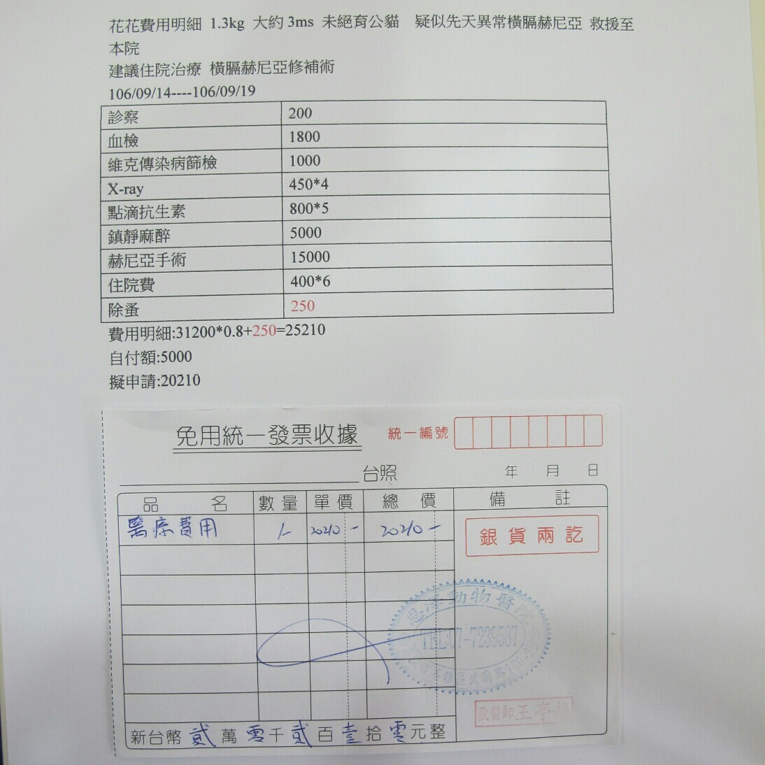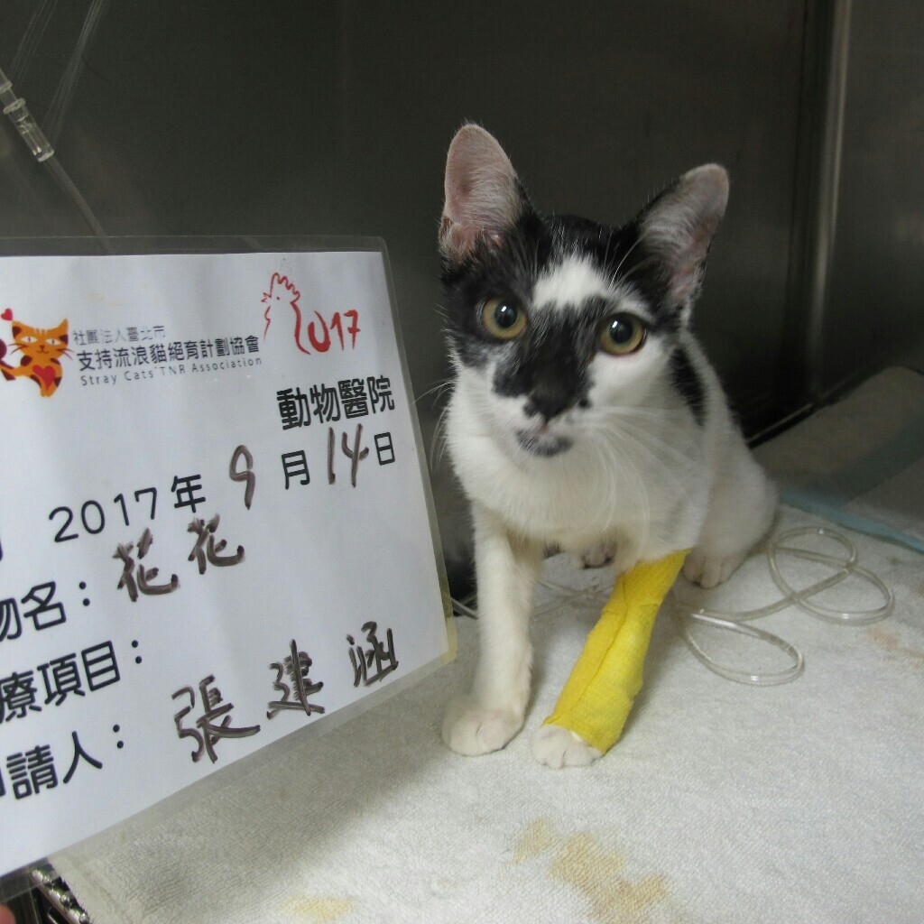 主題: 橫膈膜破裂的可憐花花 申請者姓名: 張建涵 花色: 申請日期: 2017-09-24 09:10:31 申請者部落格: 申請者臉書網址: 所在縣市/合作醫院: 高雄市/恩澤動物醫院 治療費用: 20210元 需求人數: 43人 已結案 (2024-06-01 13:22:21) 報名人員: Eight(已付款)、Min-Chen Chang(已付款)、ying(已付款)、Alison(已付款)、akiho(已付款)、那那(已付款)、Forgod Ho(已付款)、馬羅姐姐(已付款)、何偉靖(已付款)、Maggie x3(已付款)、Nana x2(已付款)、FANG(已付款)、薇薇安(已付款)、Rosa(已付款)、ohohapril(已付款)、Tsai Dobbie x2(已付款)、OV爸 x2(已付款)、tina(已付款)、林琦 x2(已付款)、Rachel Hsieh、Rachel Hsieh x2(已付款)、露咖毅 x2(已付款)、River Ho(已付款)、比比 x2(已付款)、vivian(已付款)、李永發 x4(已付款)、May x4(已付款)、nicole chen(已付款)、yangmimi(已付款)、 候補人員: 動物病情說明: 在家外面撿到一隻幼貓才兩個月大,呼吸感覺很急促和大口,有時候還會張口呼吸,帶去給醫生檢查才發現是橫膈膜破裂,肝臟腸子都擠到胸腔了,已經嚴重壓迫到肺部心臟,醫生也說肺葉已經萎縮,再不快點開刀隨時都有生命危險。 動物近況說明: 9/14 帶去給醫生血檢,血檢完沒問題立刻開刀,晚上電話通知手術成功,兩天危險期有待觀察,這一天住氧氣房