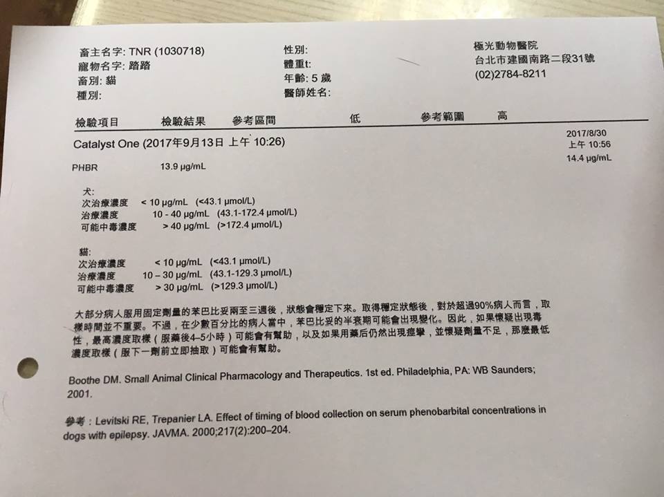 踏踏今日回診驗苯巴比妥濃度,血檢中PHBR濃度為13.9,