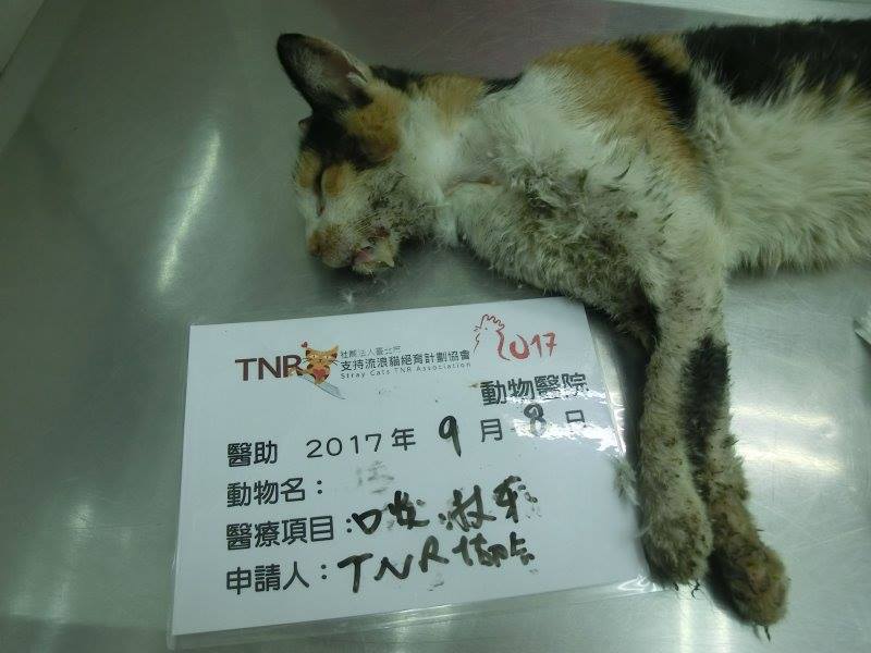 主題: 嚴重口炎進行治療的三花貓 申請者姓名: 臺北市支持流浪貓絕育計劃協會 花色: 申請日期: 2017-09-25 11:21:27 申請者部落格: 申請者臉書網址: 所在縣市/合作醫院: 台北市/欣旺動物醫院 治療費用: 8700元 需求人數: 19人 已結案 (2019-07-11 13:27:09) 報名人員: Becky Chiou x2、Weela La x2(已付款)、Nikki Huang(已付款)、Iron Liou(已付款)、薇薇安(已付款)、JEFF x2(已付款)、蜜福茶(已付款)、Miao Chang(已付款)、Miao Chang x2、琳子(已付款)、vivian(已付款)、Kate Kuo x4(已付款)、丸子 x4(已付款)、 候補人員: 動物病情說明: 民眾通報 X崙公園有口炎傷貓需抓,