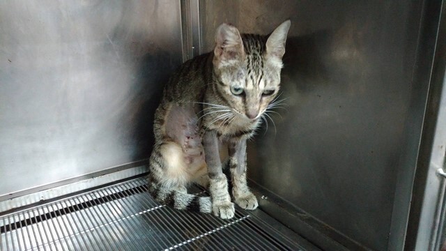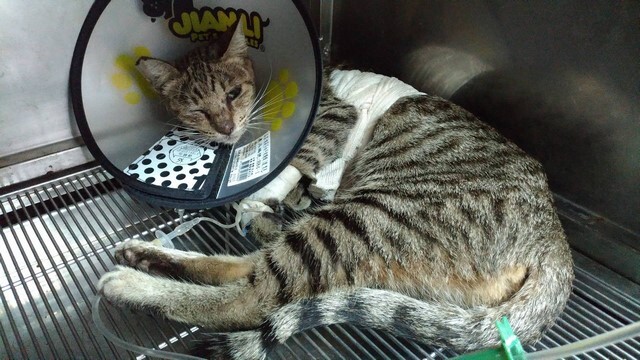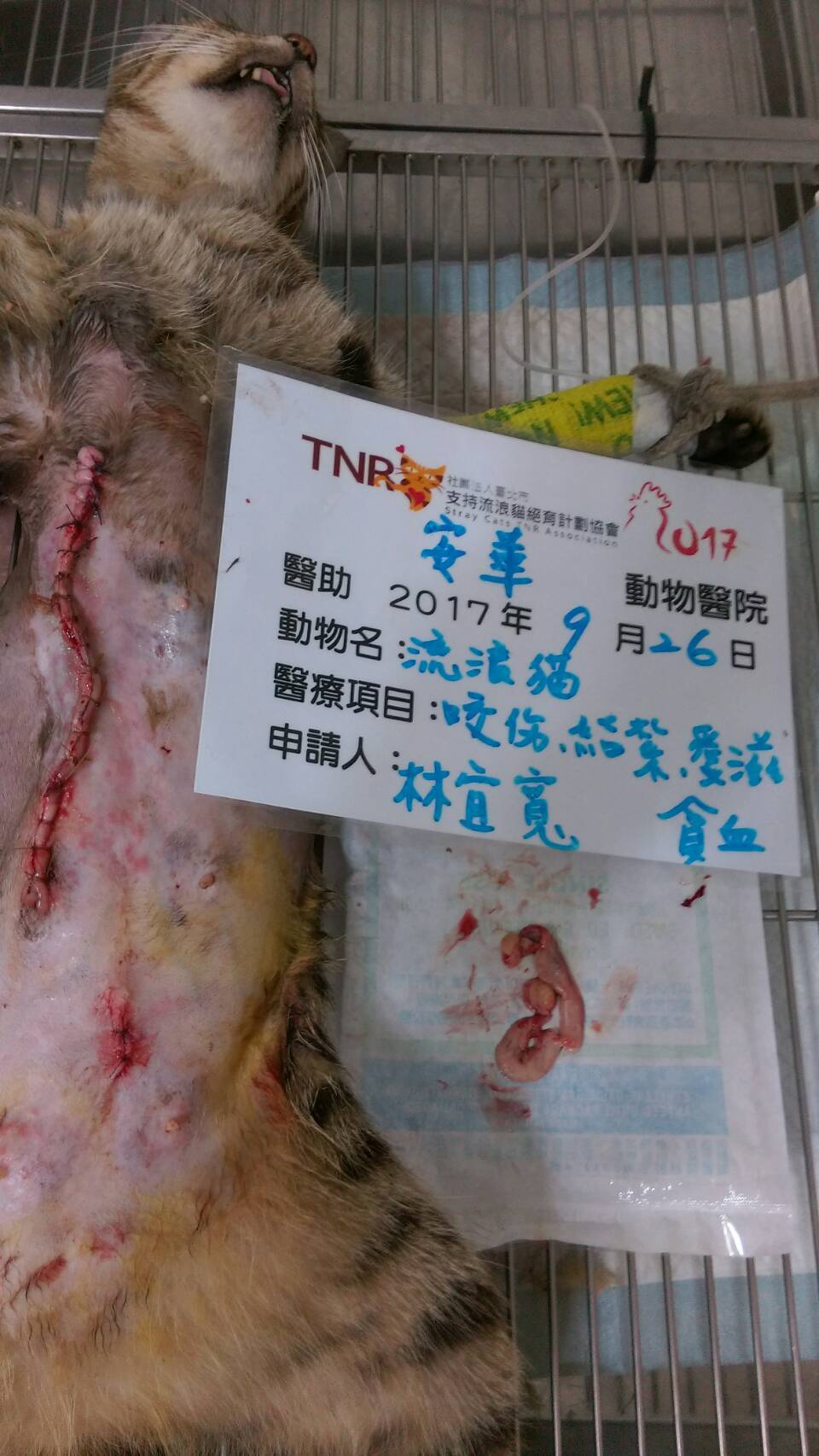 “浪喵"也在此次醫療一併結紮了,以免再次經歷骨肉分離之痛。雖然可以出院了;但考慮救援當時牠的傷口大又營養不良,出院後不敢馬上原放又沒有地方安置,所以安置住宿在醫院(住宿費自付);過幾天再帶回原放。