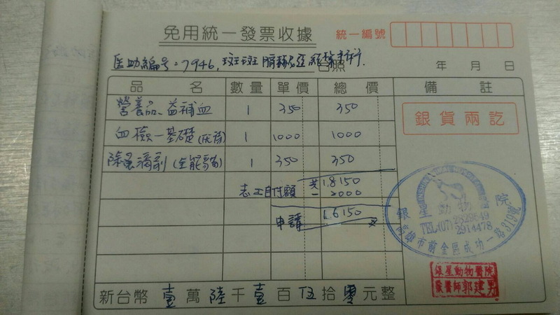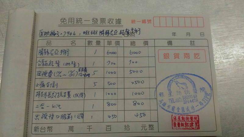 主題: 疝氣貓→斑斑 申請者姓名: 周佳旻 花色: 申請日期: 2017-11-03 01:18:51 申請者部落格: 申請者臉書網址: 所在縣市/合作醫院: 高雄市/銀星動物醫院 治療費用: 16150元 需求人數: 35人 已結案 (2024-06-01 13:20:59) 報名人員: りノ(已付款)、Ringo(已付款)、林佳欣(已付款)、Lainey(已付款)、冰小雨(已付款)、小靜妹(已付款)、Nunu x2(已付款)、sbjenny(已付款)、張雅筑(已付款)、Melody Tsai x2(已付款)、Melody Cheng x2(已付款)、Dolma(已付款)、Sydney Wan(已付款)、Eunice Chen x2(已付款)、鳳鳳(已付款)、Ginny(已付款)、雲雲(已付款)、Howl Liu(已付款)、Mia Chao(已付款)、王咪咪(已付款)、Chih C Chih(已付款)、Chih C Chih(已付款)、Nana Arthur(已付款)、郭蟬冰(已付款)、毛毛(已付款)、ChrisLin x2(已付款)、Tomoko Leu(已付款)、Becca Huang x3(已付款)、 候補人員: 動物病情說明: 斑斑是新孩子,出現在我餵養區大約一個星期,但一星期內有3天都沒出現,剛看到牠時都幾乎是趴地上,所以沒察覺到牠的肚子,直到有一次牠站起來要移動時才清楚的看到牠的肚子,一顆像球般的肉瘤,我一個人在原地演了好多的內心戲,是腫瘤嗎?還是生太多胎肚子垂還是.....,媽呀!不管啦,就是生病啦!因為他的食慾也沒有,即使我開了超香白肉罐罐也不太賞臉,趕快去跟貓友借雞絲頭,耗了一個多小時才讓牠入籠,隔天帶去醫院,醫生診斷說是疝氣,還好!嚇死我了,希望牠該完刀之後能轉性安分點別太兇 動物近況說明: 斑斑住院這段期間依然很兇,醫生和助理都很搖頭,不論是餵藥或替傷口擦藥都需要出動兩個人做保定,不過時遇上有大大提升,希望是我的營養品有發揮功用才好,出院後放回原地,飛奔跑去躲,直到第3天才出現吃飯,嚇死我了,§彥再則是有每天固定出來,真是謝謝牠老兄。謝謝斑斑住院這段期間寅星動醫院醫生和助理的細心照料,斑斑真麻煩你們了,斑斑的醫療費用還懇請大家多多幫忙,感恩!