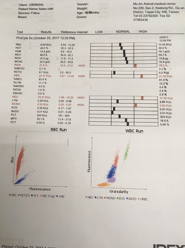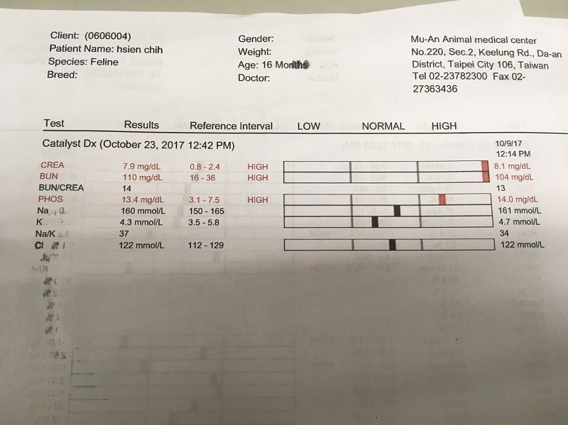 這次血檢CREA(5>6.2),BUN(75>68),PHOS(8.6>9.8),暹知體重有在上升,表示吃的比較多,腎指數有往上走一點,磷會上升是因為腎指數。