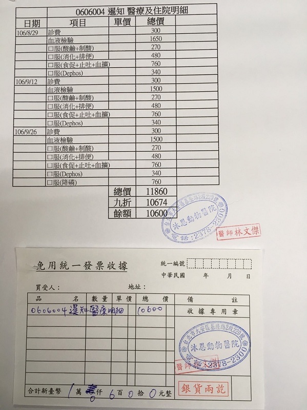 這週暹知嘔吐次數一樣頻繁,所以院方把皮下止吐劑改成口服每天吃,第一週先看止吐藥的效果如何,如果沒有明顯減少嘔吐情況,建議第二週可以改為吃好消化吸收的食物(sc27),看是否減少嘔吐次數,但腎指數勢必會再上升一些。因為暹知的體重穩定,原則上這週算穩定。