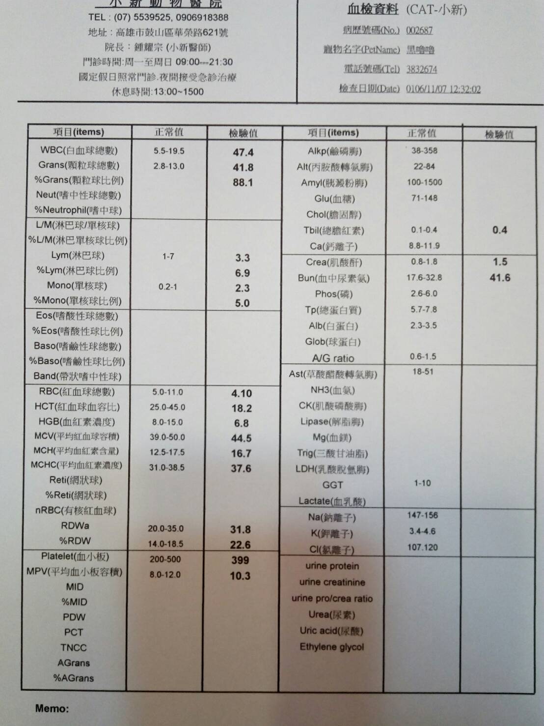 經由鍾醫師診斷發現:小橘因為厭食的關係,嚴重脫水,左側嘴唇腫大,牙齦黏膜潰爛,血檢球蛋白偏高,有發炎的狀況,貓愛滋篩檢陽性。