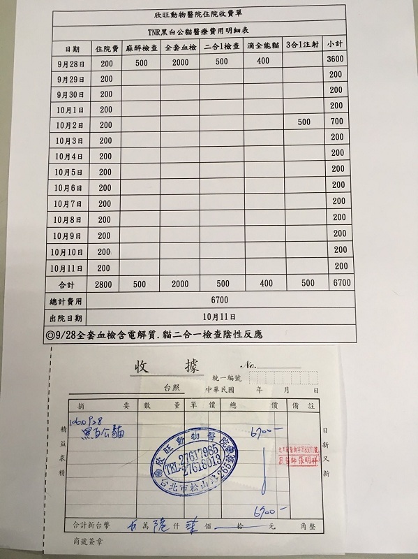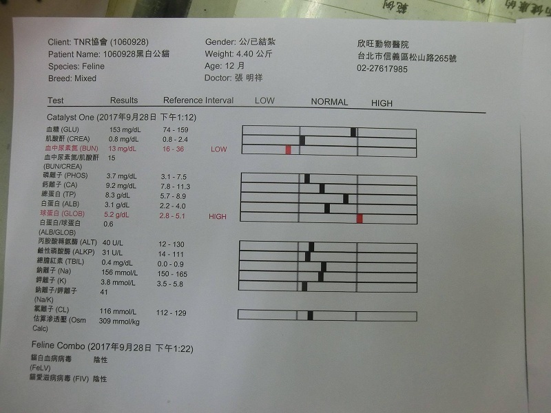 主題: 進行血檢及隔離觀察的黑白公貓小貪吃 申請者姓名: 臺北市支持流浪貓絕育計劃協會 花色: 申請日期: 2017-11-15 14:00:00 申請者部落格: 申請者臉書網址: 所在縣市/合作醫院: 台北市/欣旺動物醫院 治療費用: 6700元 需求人數: 15人 已結案 (2019-07-11 13:27:17) 報名人員: Naommi(已付款)、lunyi(已付款)、ocean、仔仔的媽(已付款)、林小豬(已付款)、Mei Hsien Liu(已付款)、雲雲(已付款)、陳小鴨 x2(已付款)、黃美芳(已付款)、Puffy(已付款)、Jessie Chang(已付款)、f43067(已付款)、bearishym(已付款)、Tzu Ning Kuo x2(已付款)、 候補人員: 動物病情說明: 小貪吃原先為已絕育的街貓