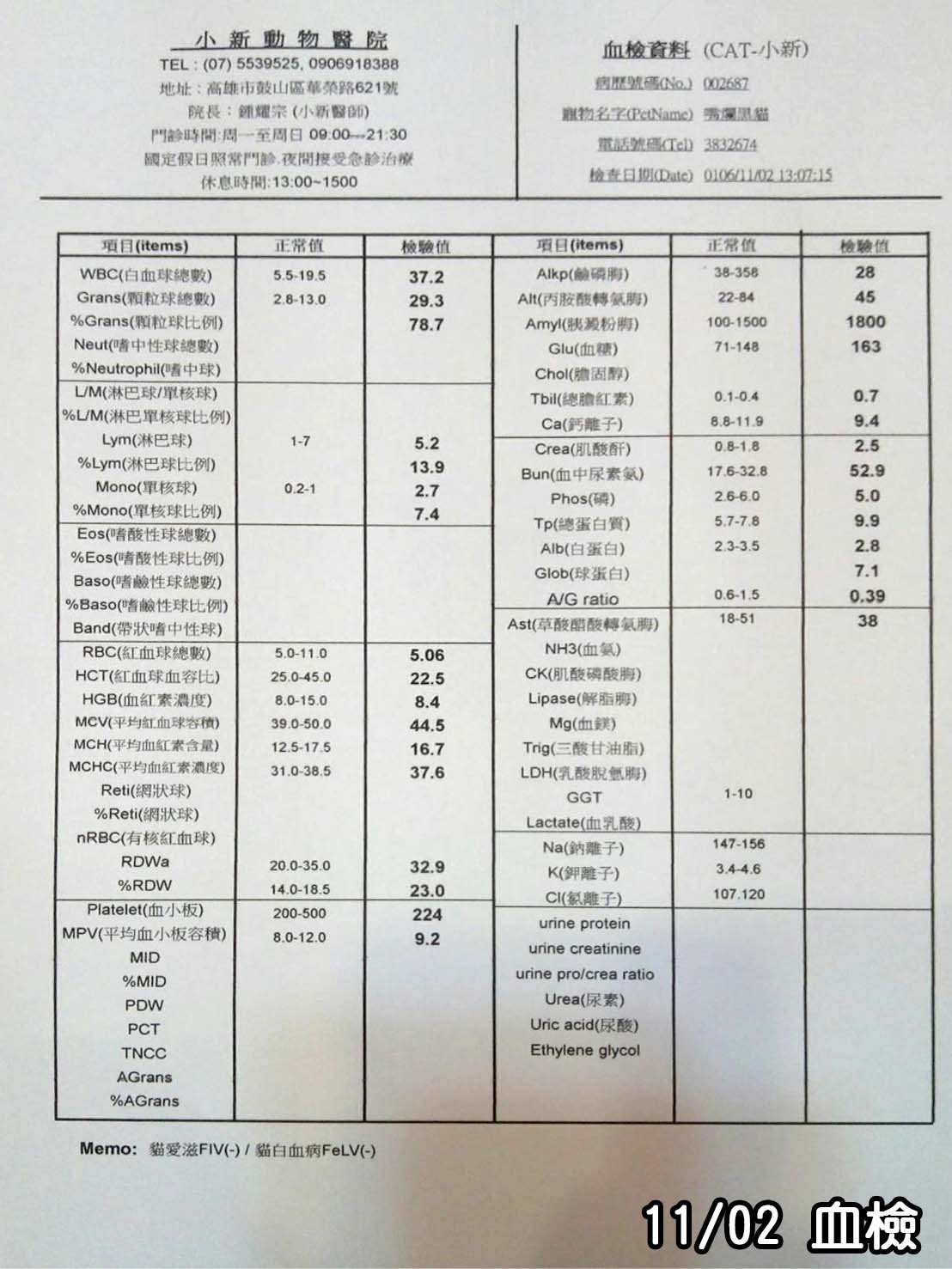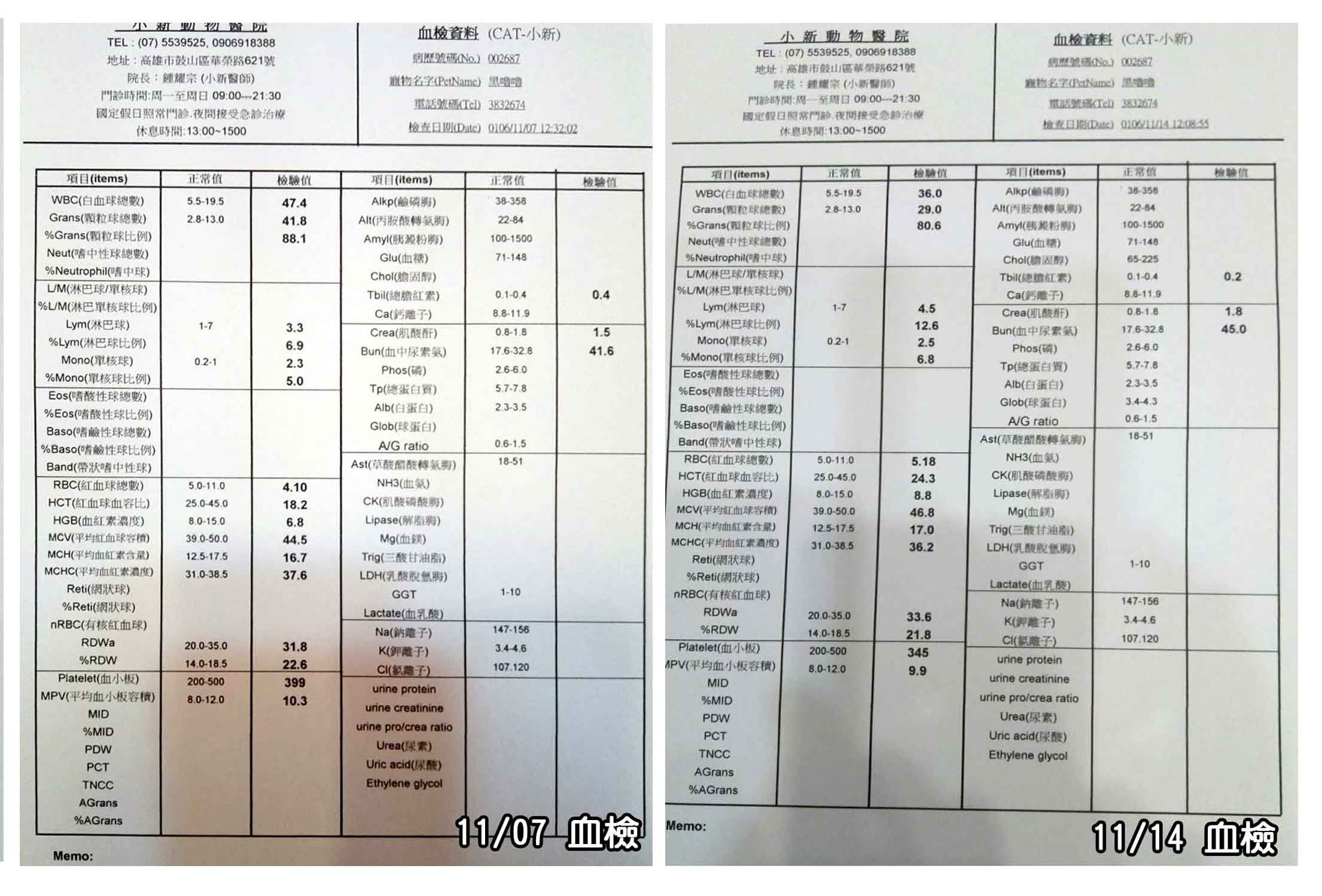 醫院不小心寫相反了。動物近況說明: 黑嚕嚕貧血有升上來了,但腎指數一直維持在那上下,沒有再下降。