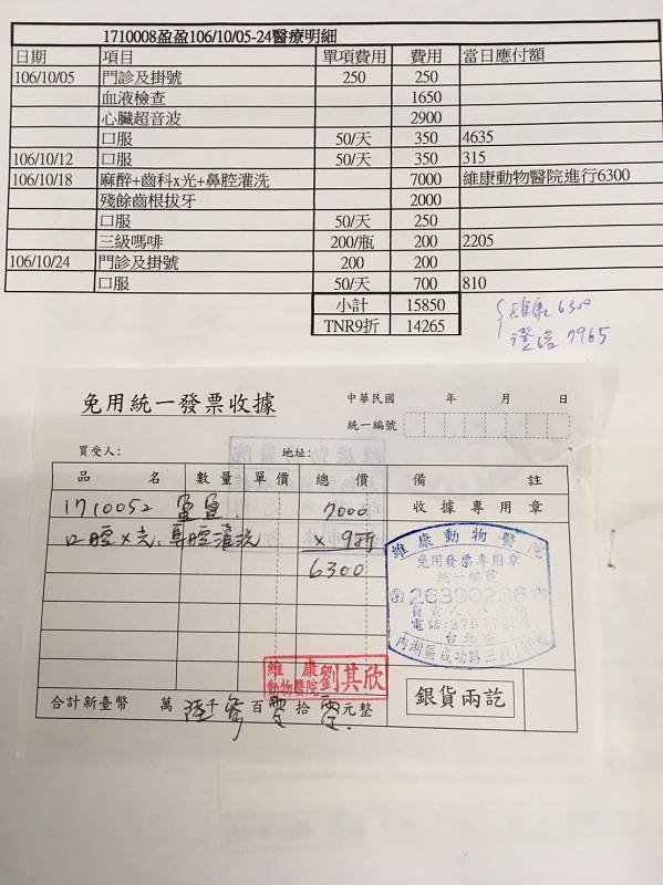 主題: 進行鼻腔灌洗以及殘餘齒根拔牙的盈盈 申請者姓名: 臺北市支持流浪貓絕育計劃協會 花色: 申請日期: 2017-11-15 11:56:41 申請者部落格: 申請者臉書網址: 所在縣市/合作醫院: 台北市/內湖維康動物醫院 治療費用: 6300元 需求人數: 15人 已結案 (2024-06-01 13:20:01) 報名人員: Angie Lai(已付款)、Sky Lin(已付款)、無名氏(已付款)、lunyi(已付款)、Claire Chen(已付款)、Chen Peilly(已付款)、寶儿(已付款)、jerr(已付款)、崎(已付款)、豬妞妞(已付款)、丸子 x2(已付款)、a-song x2(已付款)、郭銘賢(已付款)、 候補人員: 動物病情說明: 盈盈因食慾不佳及上呼吸道膿樣分泌物,