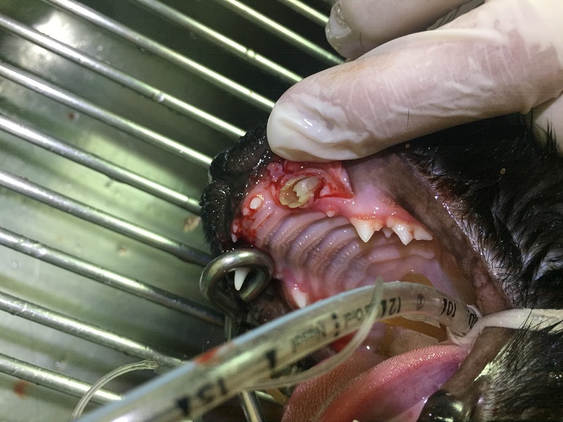 就診後發現包青天左上方犬齒發炎嚴重,牙髓外露