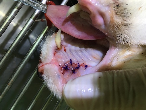 犬齒拔除後,傷口大,需縫合,兩三週後自體可吸收材質,無需拆線。這次的齒科治療, 並沒有發現蔞管問題, 也就是說, 晶晶的流鼻血症狀, 鼻腔呼吸時,發出卡卡沙沙濁濁的聲音 (像卡住那樣呼吸不順暢), 跟牙齒沒有關係, 而是單純的鼻腔發炎感染, 或醫生判斷的腫瘤造成