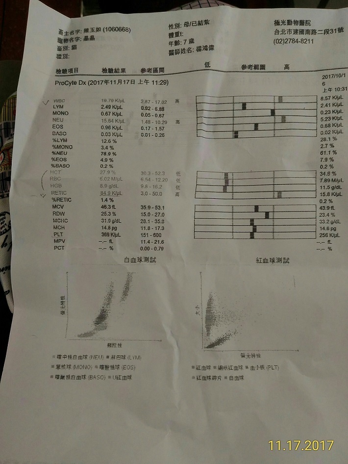 血檢結果, 紅血球, 血溶比, 血色素都低於標準值, 也就是晶晶又開始出現貧血症狀. 這跟過去三週鼻血有關, 白血球增高, 感染發炎狀況出現, 兩項抗生素, Augmentin 16mg/kg + Baytril 5mg/kg持續早晚服用, 止血與另外加開改善貧血的藥物併入一顆膠囊, 一日服用一次. 兩週後 12/1 再回來拿藥.