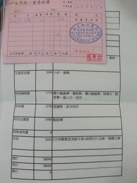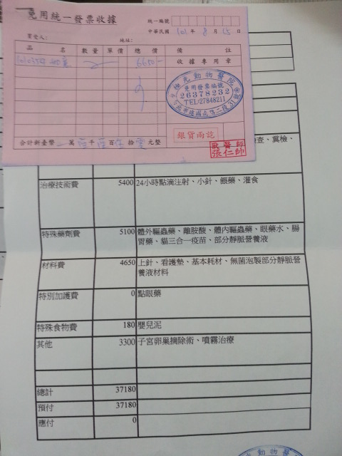 牠們的醫藥費扣掉先前預付的兩萬(一隻預付一萬),現在吉祥還缺28090元、如意還缺27180元!!!!