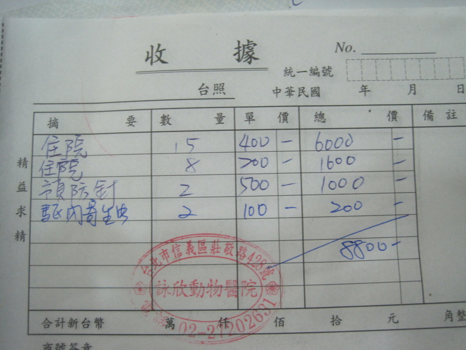 主題: 平溪張媽媽的2隻貓咪治療拉肚子和呼吸道感染 申請者姓名: 敏大哥 花色: 申請日期: 2012-08-21 23:14:12 申請者部落格: 申請者臉書網址: 所在縣市/合作醫院: 台北市/詠欣動物醫院 治療費用: 8800元 需求人數: 20人 已結案 (2013-06-27 13:27:53) 報名人員: polly(已付款)、bellaling(已付款)、kelly(已付款)、kelly(已付款)、KK、王興賢(已付款)、Savory Yen(已付款)、Rean Wu(已付款)、dplantis(已付款)、Cecilia Chang(已付款)、Chiaping Chang(已付款)、夏皮南(已付款)、Zn-Ying Chio(已付款)、Moon Wu(已付款)、阿熊(已付款)、f43067(已付款)、Mi-chi Jing(已付款)、小嫺、火鳳貍(已付款)、火鳳貍(已付款)、小舟、Mia Wei(已付款)、yushi0304(已付款)、 候補人員: 小舟、 動物病情說明: 平溪張媽媽收留的小貓咪,先治療他的呼吸道感染 球蟲和梨形鞭毛蟲造成的拉肚子.讓貓咪的病痛醫好,健健康康.目前送到岳姐家中途和送養.