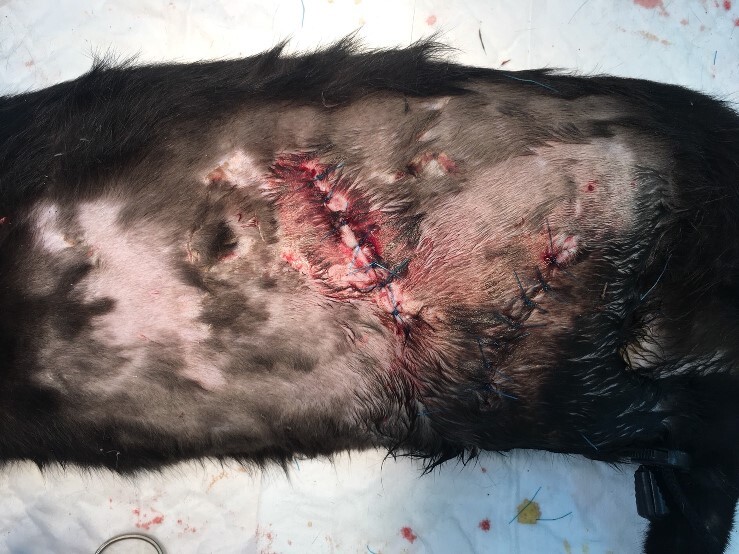 1061231 今年的最後一天下班去看看小黑碳,剃掉毛的地方,部份開始在長毛了,醫生說傷口狀況不錯,過幾天就可以拆線了。