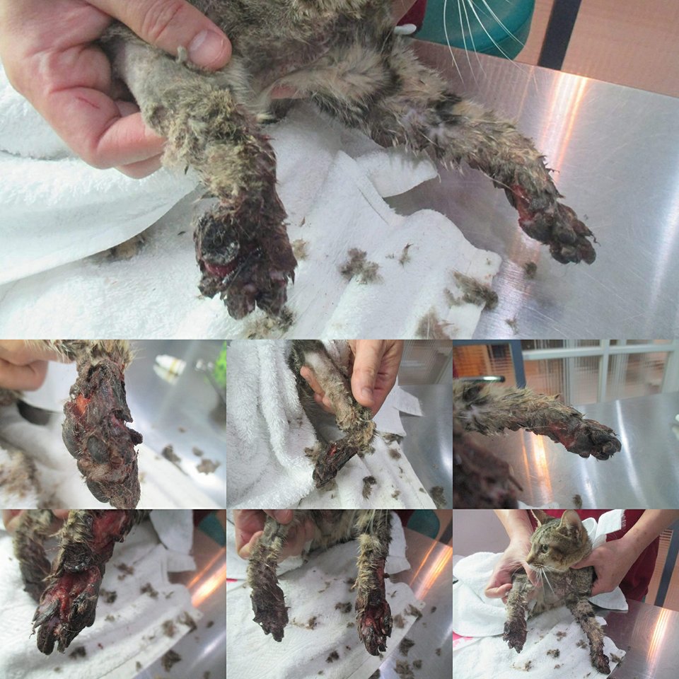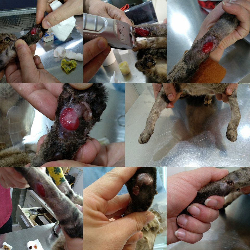 因為肚子有開過刀的傷口~所以推測會不會是有人結扎的貓~~但腳上的傷口實在沒辦法去知道怎麼傷到的~還這麼嚴重~~所以沒辦法去了解是結扎的貓被原放後~後來腳又受傷~~還是再原本的醫院就這樣~人家不願治療被丟在路邊等死~~剛好被我發現~~