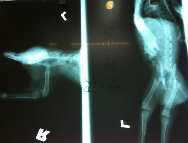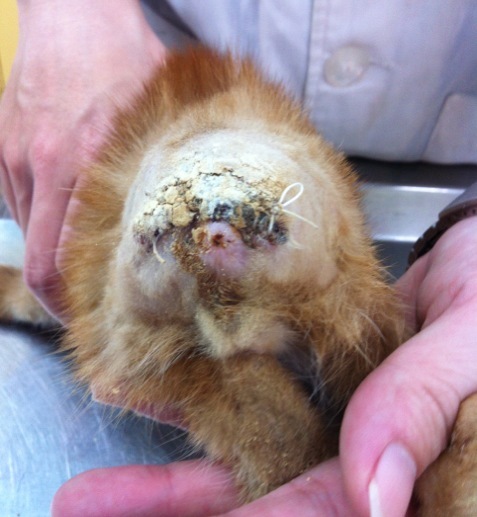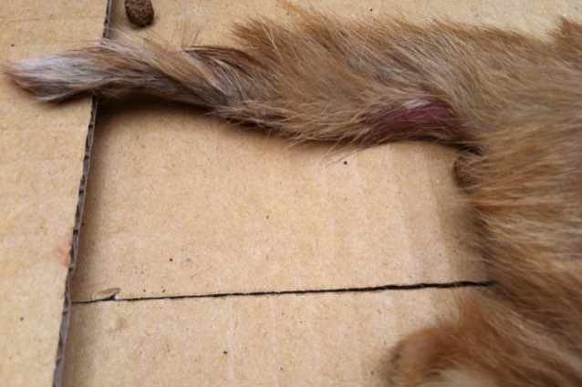 因車禍致最後腰椎及尾椎嚴重損傷,貓咪傷口車禍至送院開刀為止醫師判斷已有5-7天,且尾巴(尾根基部組織)整條坏死,但後肢仍可站立(勉強)及排便,經考慮後決定先手術切除坏死尾巴(整條),手術後恢復良好,亦漸漸可走動。