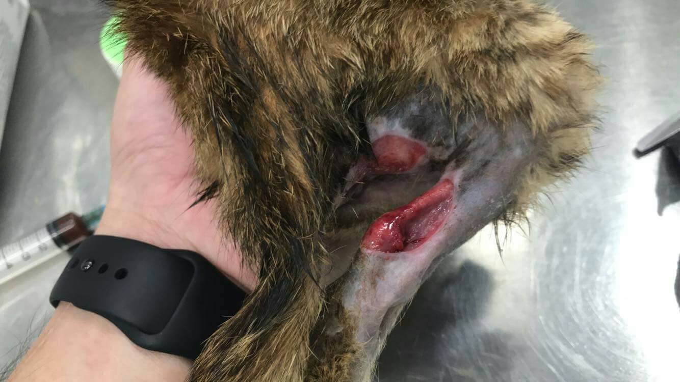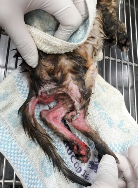 醫師預估約年齡約兩個月大,麻醉後清洗傷口,後肢皮毛皆已磨光,癱瘓導致嚴重褥瘡。