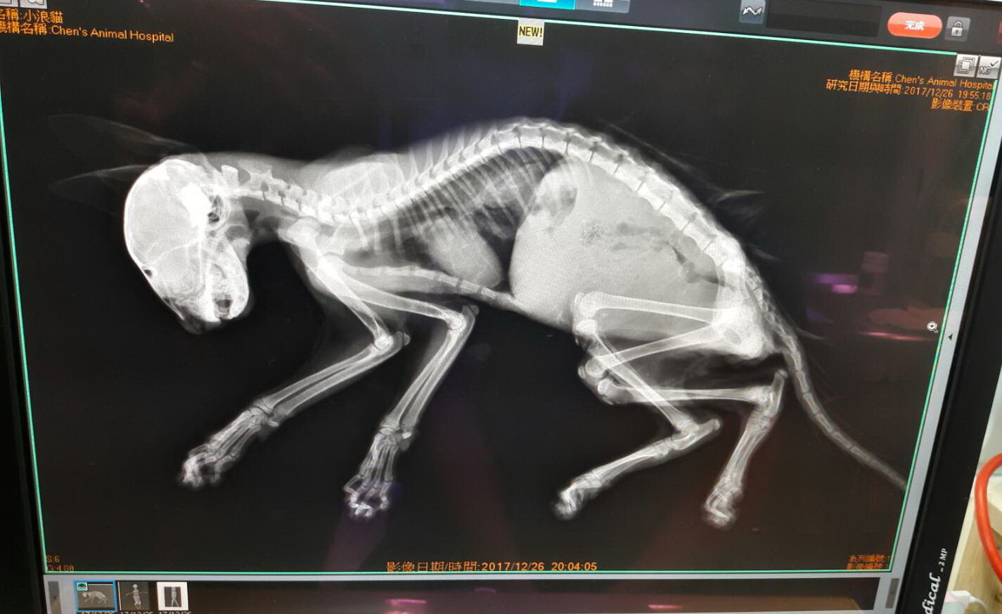 X光骨頭沒斷,腹水較多,後肢不明原因癱瘓萎縮,體溫偏低測量不到,醫師先給予點滴治療及保溫設備保暖,後肢傷口上藥。
