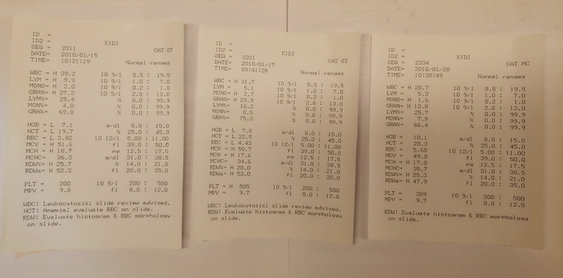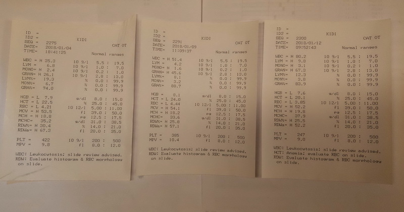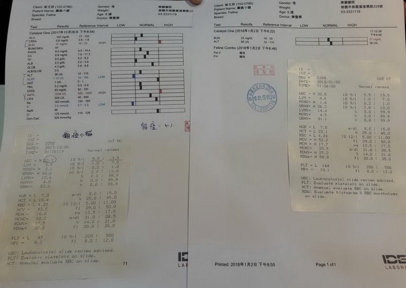 後腿傷口只剩小面積未癒合,近幾次血檢白血球量皆偏高,1/12飆高至80.2(正常值19.5),醫師持續給予不同種抗生素治療,今日血檢白血球量稍微下降至31.7,排便仍需軟便劑輔助。
