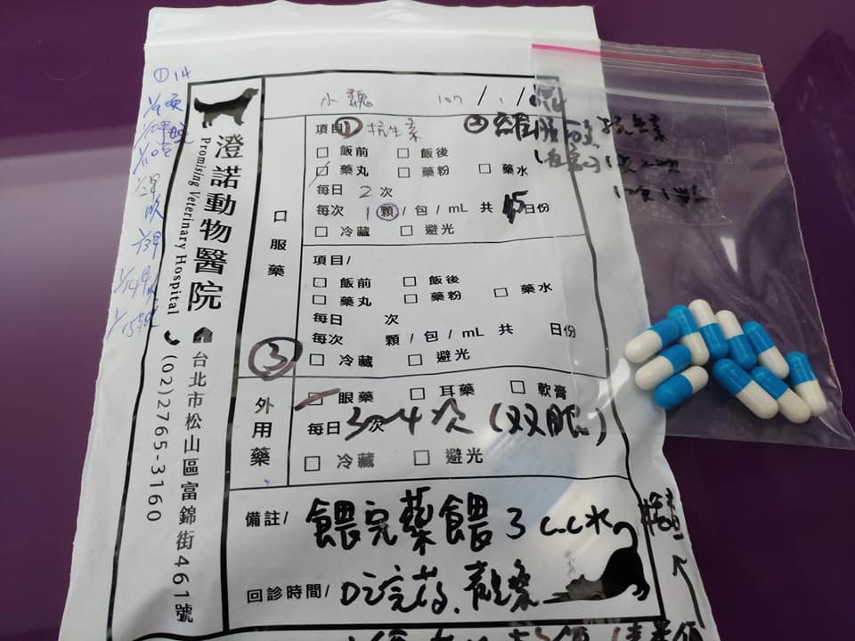 有抽血檢查,鼻塞、淋巴結腫大、眼瞼也紅腫,醫師擔心是披衣菌感染,要單獨隔離關籠不要與其他貓接觸;食物請給小魏香一點引誘她有食慾多吃