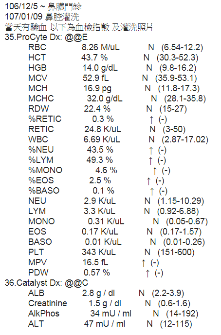 血檢正常,目前整體狀況來看如果抱抱還有鼻涕鼻水請盡量擦、或吸鼻涕時能吸就吸,只要不是一天噴五六次以上的大量鼻涕都還可以接受,如果鼻涕量開始越來越多就要再去醫院麻醉清洗鼻腔;抗生素先暫停只給化痰