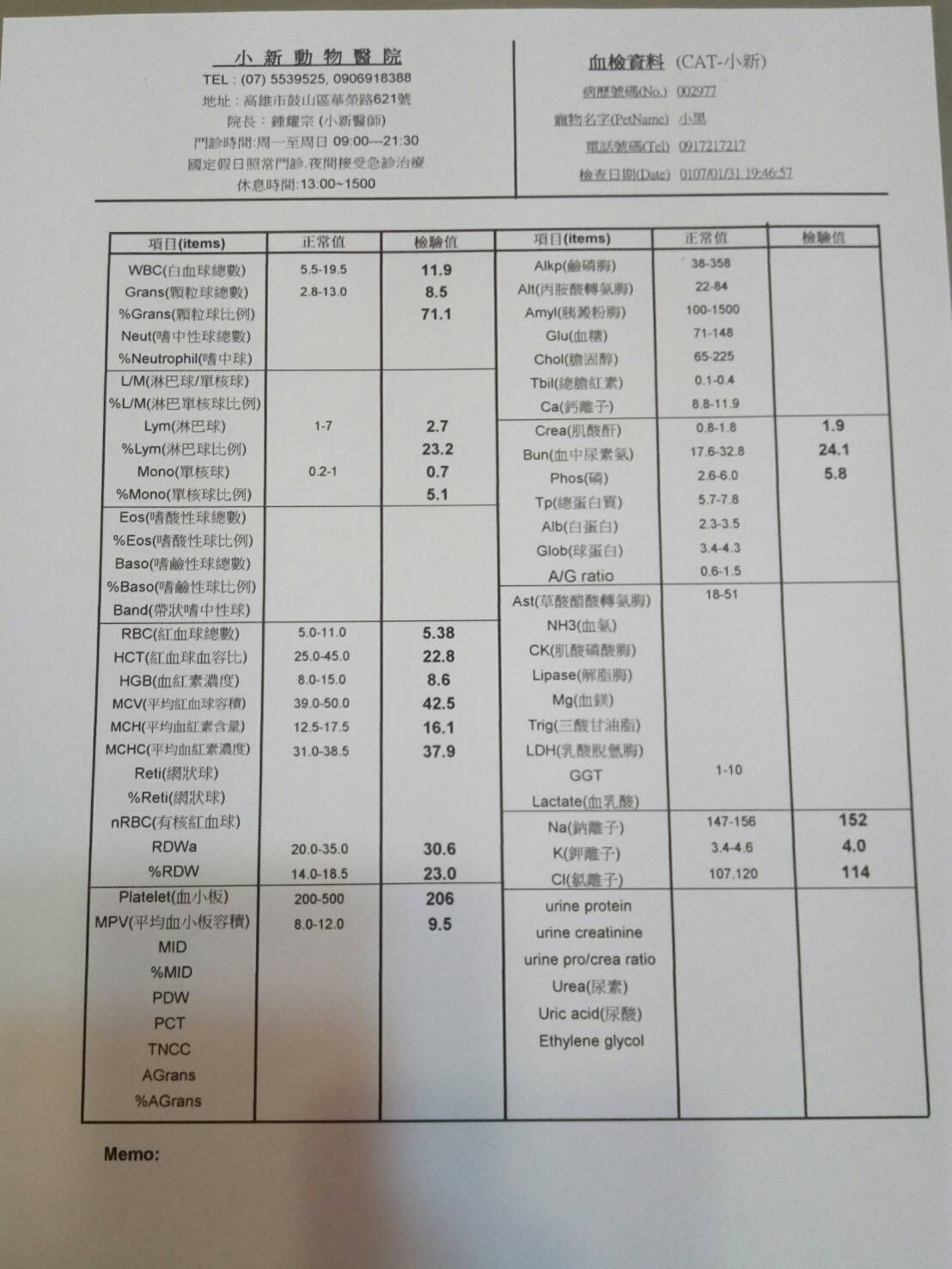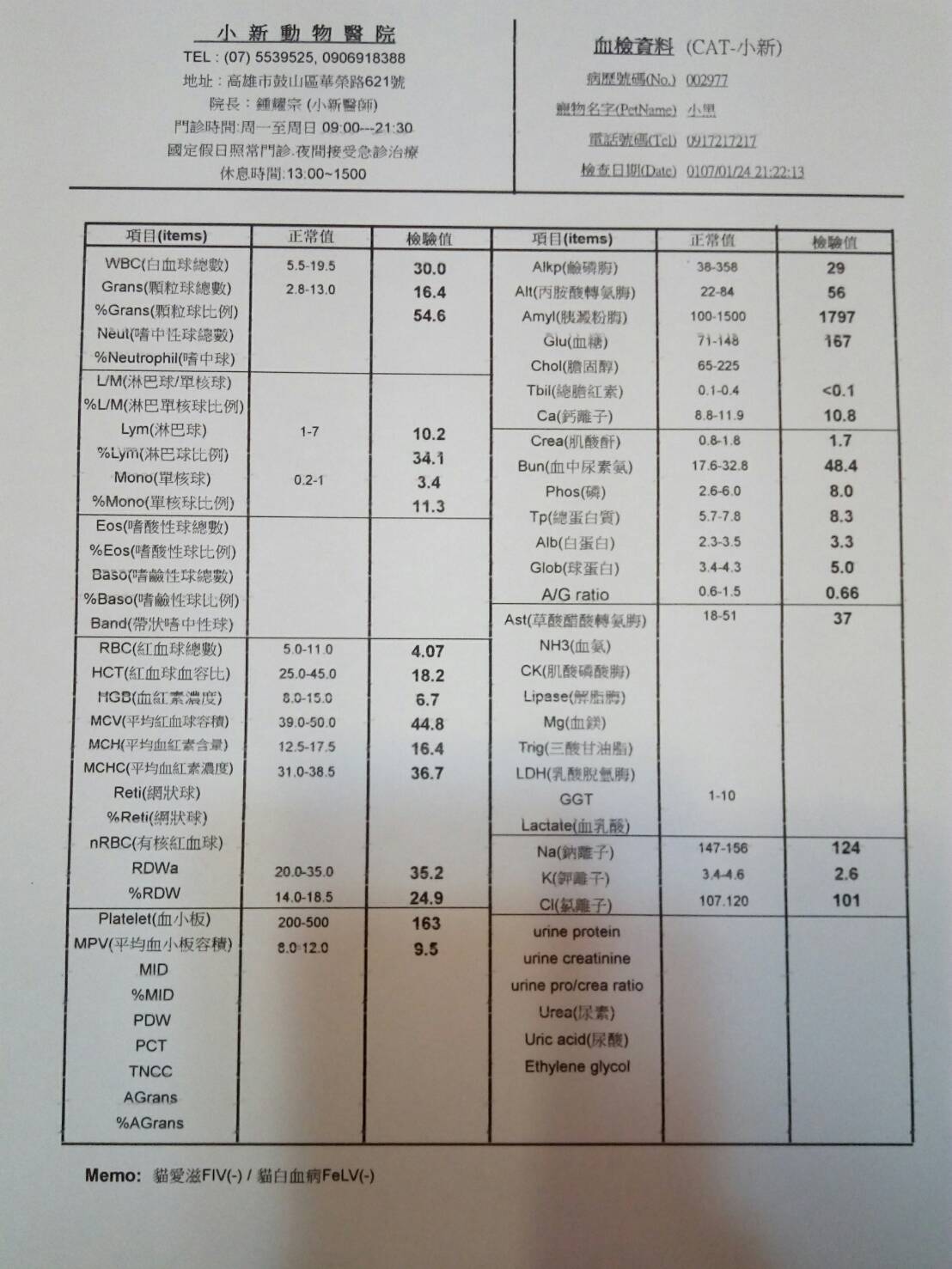 聽到檢查結果,愛媽快要嚇傻了。因為血檢結果貧血很嚴重,先處理這部分,等身體狀況好些後再處理接下來的問題。動物近況說明: 經過了半個月的治療,小黑狀況有較穩定,但沒很大的起色。