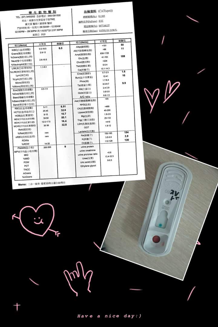 主題: 鼻氣管炎3天不吃不喝眼睛分泌物嚴重虛弱的花花 申請者姓名: 張俞兒 花色: 申請日期: 2018-02-20 20:37:32 申請者部落格: 申請者臉書網址: 所在縣市/合作醫院: 高雄市/樂生動物醫院 治療費用: 23200元 需求人數: 49人 已結案 (2024-06-01 13:16:40) 報名人員: 蘇洛克(已付款)、Rara Hsu(已付款)、Amber Shih(已付款)、林逸鈞(已付款)、Misty Cheng(已付款)、張苡寊(已付款)、Anting(已付款)、喬安徐 x2(已付款)、小美(已付款)、薇薇安(已付款)、Yumi Ho x2(已付款)、邱信慧(已付款)、陳佳菏(已付款)、陳佳菏、H2C(已付款)、vivian(已付款)、玉玲瓏(已付款)、Krystal(已付款)、Hua Wang x2(已付款)、白婷(已付款)、JEFF x2(已付款)、vopoo(已付款)、Ivy(已付款)、小靜 x2(已付款)、Jacka(已付款)、Lung(已付款)、坑長(已付款)、anne(已付款)、小喵 x4(已付款)、錢快來(已付款)、劉宜琳(已付款)、shizuko(已付款)、潘潘 x9(已付款)、草莓公主(已付款)、 候補人員: 動物病情說明: 餵養區的花花因為這波寒流鼻氣管炎嚴重,眼睛分泌物很嚴重3天不吃不喝,因為花花會怕生,太靠近她就會離開,耗了一些時間抓她,抓到了馬上送醫,醫生檢查後說花花有嚴重脫水,口炎及牙結石,驗血二合一檢驗都為陰性,有結膜炎,第三眼臉有受傷及打噴嚏等鼻氣管炎症狀,耳朵內也有發炎,目前已先給藥,輸液治療,待狀況穩定後會安排洗牙及拔牙。 血檢報告肝腎指數正常,但有脫水所以因該還是有貧血的現象 。