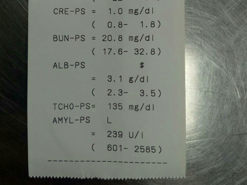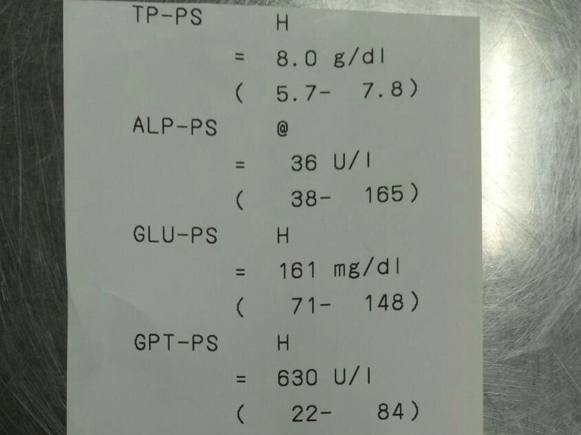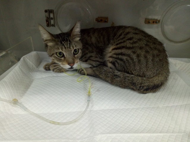 經過了3天,昨天他晚上終於出現但感覺就是沒有精神及元氣,經我初步檢視他的外觀,發現下巴好像腫漲,有出血過,於是趕快送到醫院做更進一步檢查。結果血檢出肝指數異常的飆高,再進一步照X光,才發現原來肋骨斷裂,且心臟部分有出血,有生命危險,推斷可能是出了車禍,現在以氧氣點滴抗生素治療,希望能止住出血讓他能儘快恢復。動物近況說明: 斑斑住院三天內算是危險期,不過他食慾和精神都很好,體力也慢慢地恢復,住院一週後,也無異常狀況發生,所以照預定期間住院二週後出院,出院前為確保他復原正常又再拍了一次X光,確認已沒內出血的問題,也幫他打了預防針後,接回素食攤老闆娘家中靜養,目前一切都很正常。