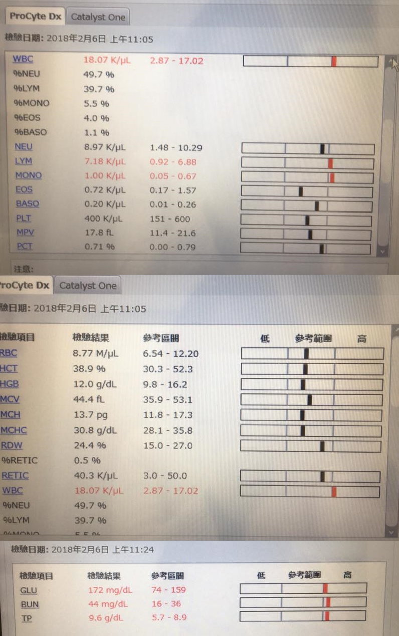 血檢顯示上次WBC20、今天18.07,上次TP是10、這次9.6,表示藥還是有吃進去所以有好的數值;但對類固醇反應就普普通通,每次都是第一次吃新的藥很有效果,繼續吃到後面就又變得沒有用了。