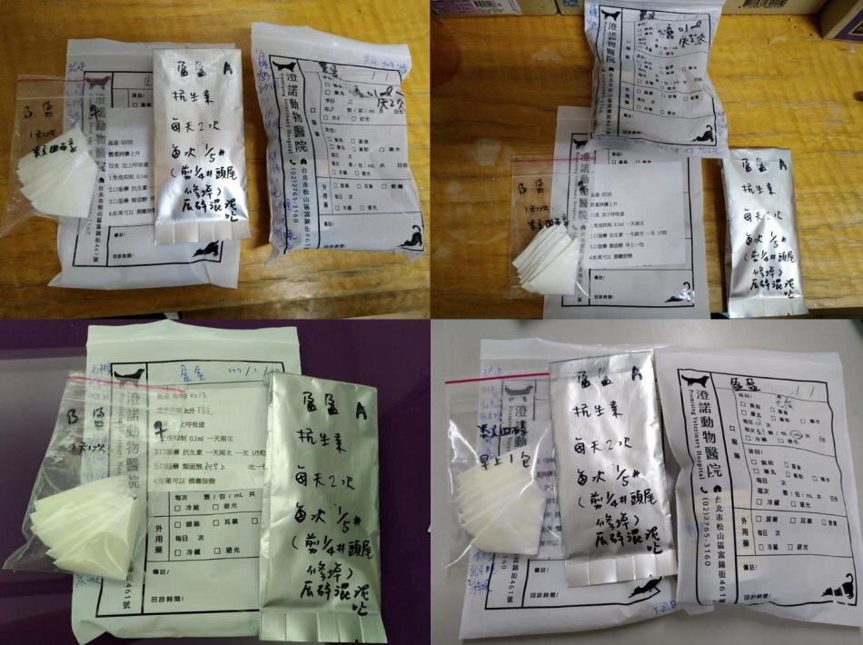 A)抗生素:一天兩次,一次1/5,藥需避光、請把受潮處剪掉,剪完的抗生素壓碎混嬰兒泥魏給盈盈吃
