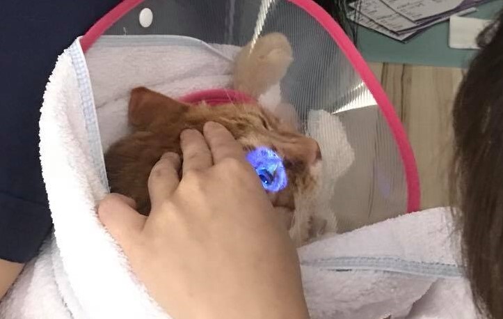 眼睛的部分,目前紋貍頭套要一直戴著,避免因過度洗臉而造成角膜潰瘍更嚴重,原本使用的眼藥水,不要再用了,改成氯絲菌素眼藥水(需冷藏)。