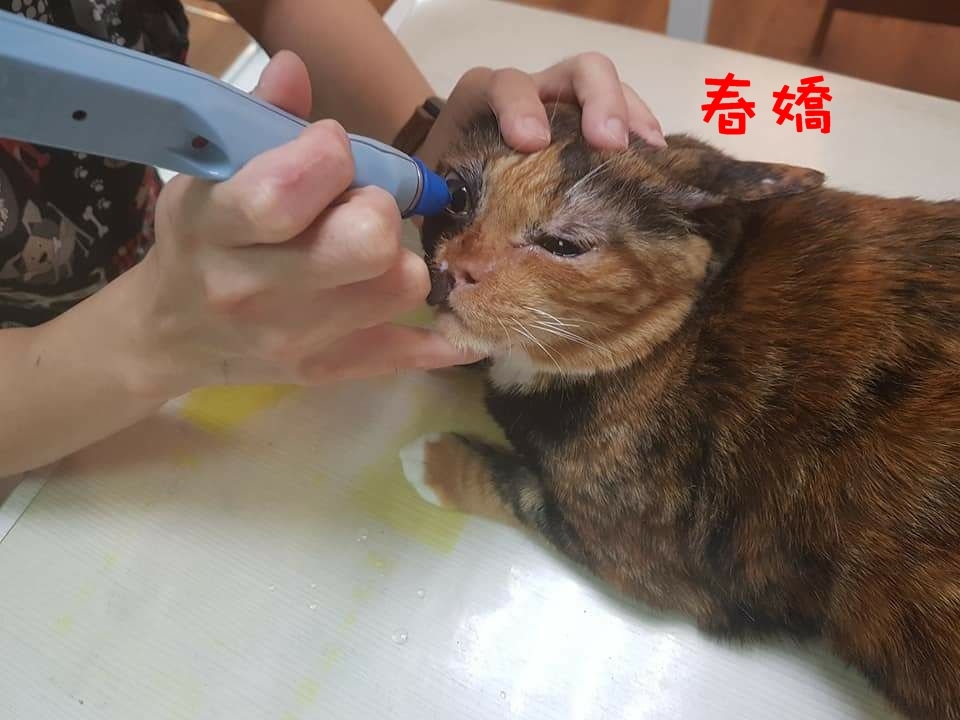 可使用人工淚液,及用剪刀或電剪,將溫泉君眼睛旁邊的毛剪短。動物近況說明: [春嬌]