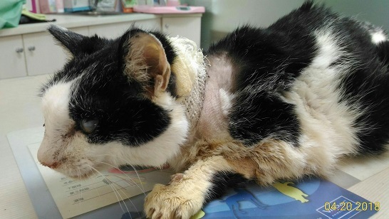 醫生說, 厭食有可能是腫瘤的惡質病現象, 也可能因為鼻塞聞不到所致, 但是不吃, 會一直衰弱下去, 最後是營養不良虛弱而走,而不是腫瘤奪命. 在醫生的建議下, 三月初進行安裝食道餵管後, 貓咪不主動進食已經兩個月了. 持續給予足夠的營養與藥物供給, 保持體重與控制感染發炎, 是目前的醫療照護重點. 最大的希望是孩子能恢復主動進食.動物近況說明: 安裝食道胃管後, 一天要透過食道胃管, 餵食四次。食物,藥水都進管子餵食.每日注意傷口清潔,換包紮, 避免感染.. 透過餵管餵食高蛋白食物, 保持每日應攝取的熱量, 確保完整的營養與藥物供給, 將近兩個月了, 但是孩子仍舊沒有自主進食的慾望, 常常窩著不太活動, 有時候屎尿會上在座墊上, 身體毛髮也不太自理. 還好便便有成形了.