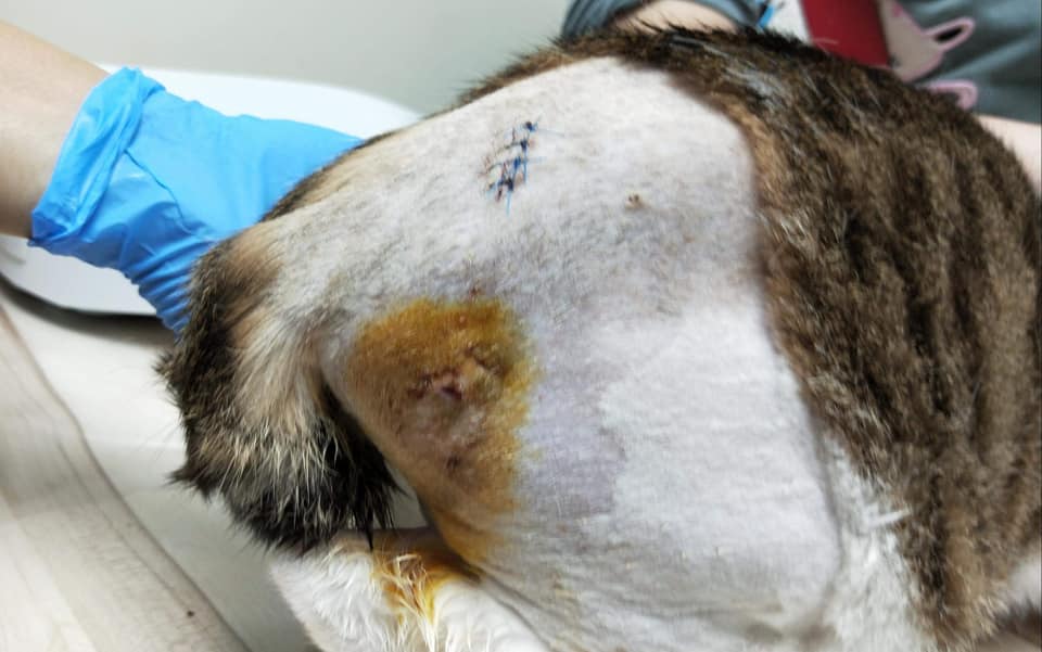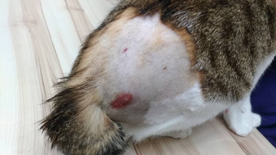 1.溫溫剃毛之後發現右後大腿根部靠近屁股的地方有血腫,且有被打洞的痕跡,醫師隨即決定麻醉引流。