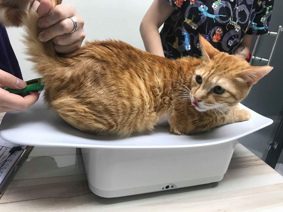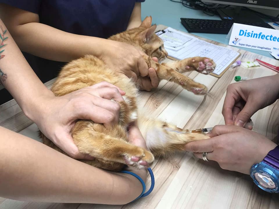 胸水檢驗確診為溼式腹膜炎。動物近況說明: 醫療上配合醫師指示,定期回診、驗血、照超音波、服藥,按日施打干擾素及造血針;照護方面,住三層籠隔離,每日測量呼吸心跳、備有氧氣機隨時讓牠可以舒緩呼吸、選擇適合牠的營養食物煮鮮食希望可以讓牠維持體力。
