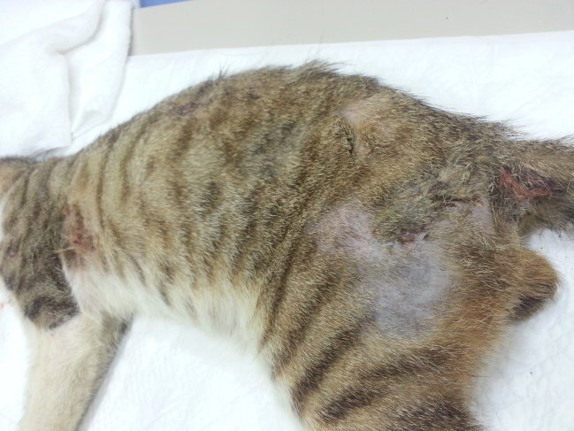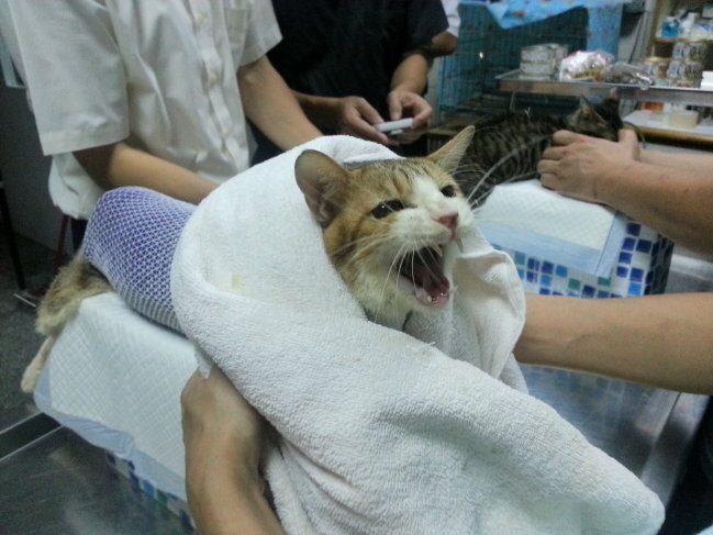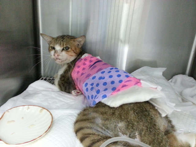 在中山區公園被狗咬傷的虎斑公貓。