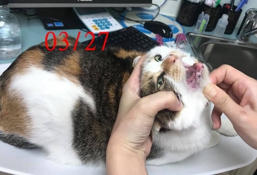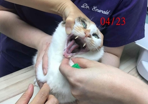 胖子吉於去年被協會救援當時的狀況很不好,有腎衰、口炎嚴重、貧血、肝炎,免疫力很差,經多次檢查治療及拔牙後已改善很多,現在就定期回診檢查、服藥打針。