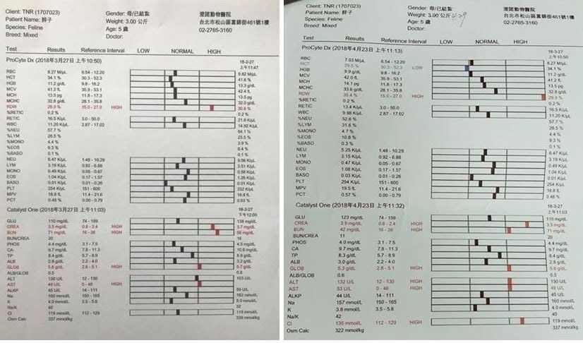 血檢肝腎大致穩定,CREA的指數上升,研判可能是因為牠體重增加,相對的之前開的類固醇劑量就變不夠,再觀察牠之後情況看是否需要調整。