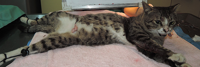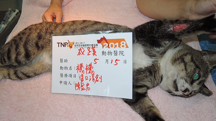 主題: 手肘下方受傷,走路掰咖,皮膚掀開4-5公分,肌肉外露,清創縫合的襪襪 申請者姓名: Fiona Chen 花色: 申請日期: 2018-06-01 11:37:10 申請者部落格: 申請者臉書網址: https://www.facebook.com/profile.php?id=100009826632869 所在縣市/合作醫院: 新北市/成蹊動物醫院 治療費用: 6350元 需求人數: 14人 已結案 (2024-06-01 13:11:49) 報名人員: 徐(已付款)、紅月 x2(已付款)、張嘉琪(已付款)、雲荻(已付款)、Zoey Yeh(已付款)、斑比(已付款)、Claire Huang(已付款)、何偉靖(已付款)、Ingham Kao(已付款)、洪凱威 x2(已付款)、平(已付款)、iamdavidga(已付款)、 候補人員: 動物病情說明: 襪襪是是很聰明的大公貓,平常不太準時報到吃飯,想吃好料才會來找我,但是自從受傷以後就每天準時來吃飯,還有意無意的站在高處,讓我看到他不容易被發現的傷口,傷口有點嚴重,皮膚與肌肉分離,靠傷口四周的皮跟肉連著,可以清楚看到肌肉的紋理,走路掰咖越來越嚴重,前幾次誘捕失敗,後來可能腳太痛了,就乖乖進誘捕籠了。 動物近況說明: 襪襪雖然是大公貓,但是個性很憨,每次去看他都呆呆的望著我,可以隔著籠子偷摸他不打人,受傷的那隻手永遠都捲起來不給別人看,在醫院好吃好睡的,不用帶頭套也不會去咬手上的縫線,恢復狀況良好。