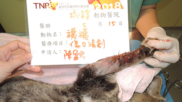 襪襪傷口已拆線,目前已經放回原地,已將移似害他受傷的物品清除,後續後會持續注意他的身體狀況,感謝協會伸出援手,也懇請大家幫忙這肥嘟嘟孩子的醫藥費用,感謝大家。