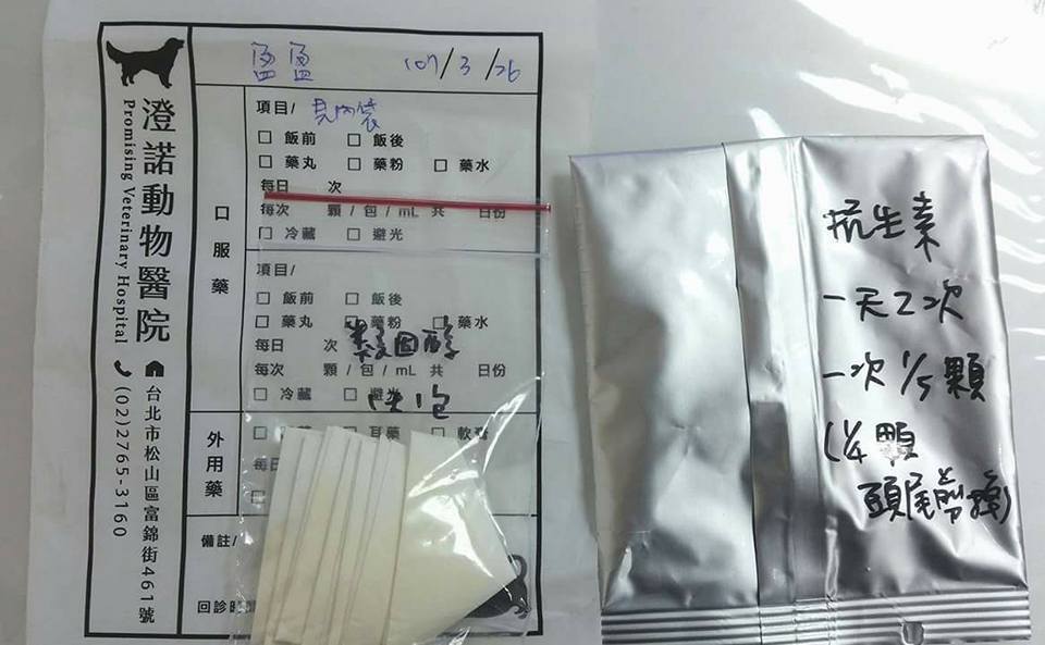 1.抗生素:每天兩次,每次1/5顆(剪1/4顆,剪掉氧化黃色處為1/5顆),需避光。