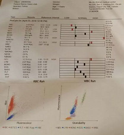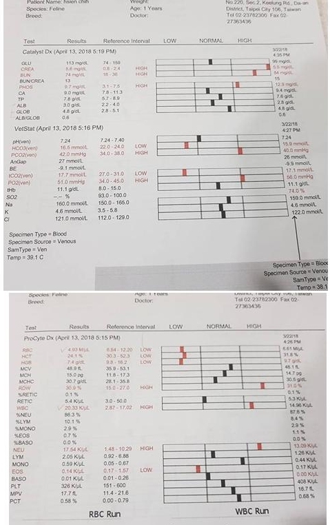 今日暹知體溫略高,精神不好,臨時加診,血檢結果紅血球掉太快6.61--》4.93,白血球略高14.96--》20.33,擔心是否有感染或腸道出血,有作局部超音波沒有發現異常。另幸好腎指數沒有受影響,Bun84--》74,Crea5.5--》5.6,磷Phos12.9--》9.7,可能是造血不足的影響,決定先把紅血球拉高,再觀察是否有感染。